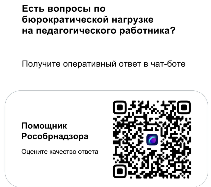 Рособрнадзор напоминает о возможности задать вопрос о снижении бюрократической нагрузки учителя через чат-бота. Для этого отсканируйте QR-код выше и задайте необходимый вопрос или перейдите по ссылке.